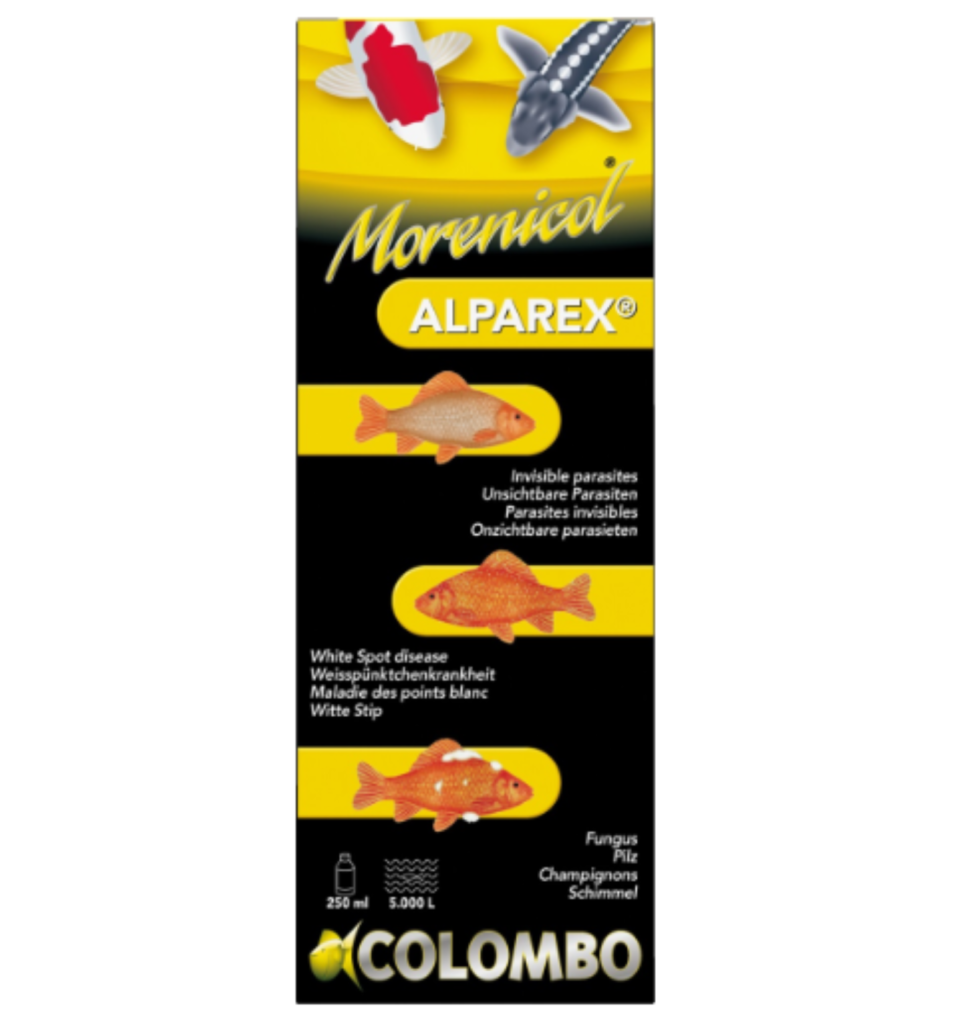 Traitement maladies de poissons Colombo contre les parasites dans le bassin de jardin, Alparex est actif contre les parasites tels que l’Ichthyobodo (Costia), le Chilodonella et le Trichodina