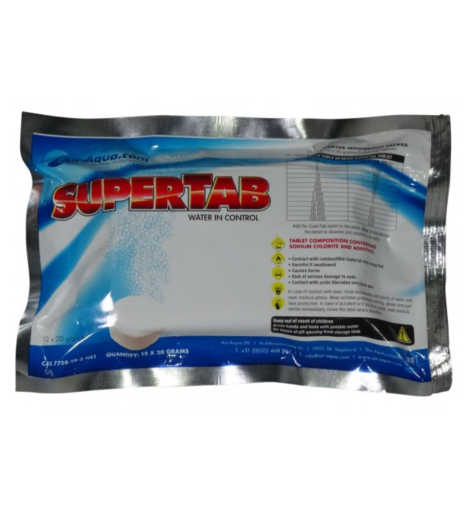 Le SuperTab est constitué de dioxyde de chlore (ClO2) sous forme de comprimé. Il s’agit d’un nouveau développement destiné notamment à faciliter fortement l’application du produit. Le dioxyde de chlore (à ne pas confondre avec le chlore !) est un oxydant relativement faible. C’est pour cette raison qu’il peut se trouver, à l’état libre, à une certaine concentration dans l’eau potable, ainsi que dans des étangs ou bassins abritant animaux et autres êtres vivants.